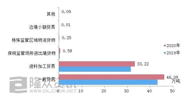 2020年中国聚醚的出口贸易方式较2019年仍无明显变化。一般贸易占据主导,出口量为46.09万吨,同比增长6.8%,占比总出口量的57.4%,其次是进料加工贸易,出口量为33.22万吨,同比增长5.6%,占比41.4%。两者为我国最主要的聚醚贸易方式,合计占比达98.8%,与2019年相比下降0.4%。